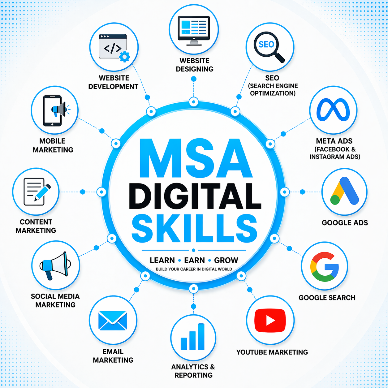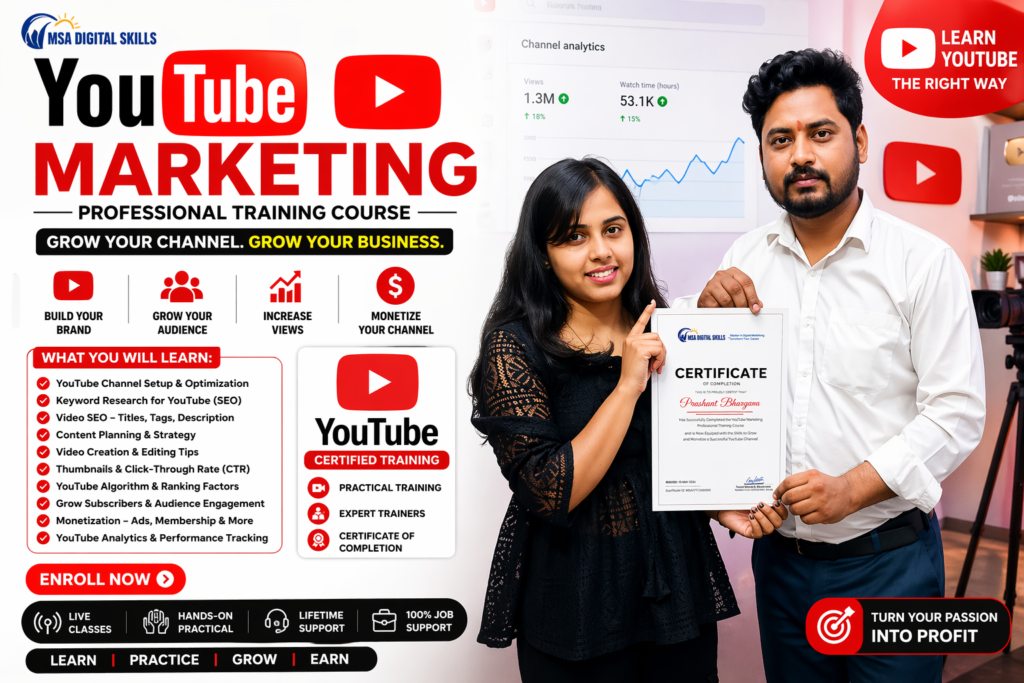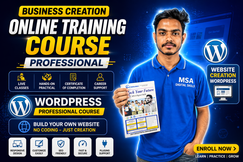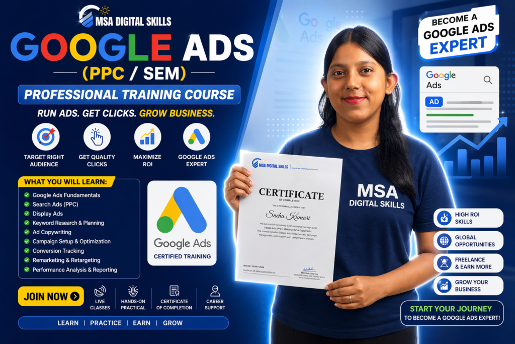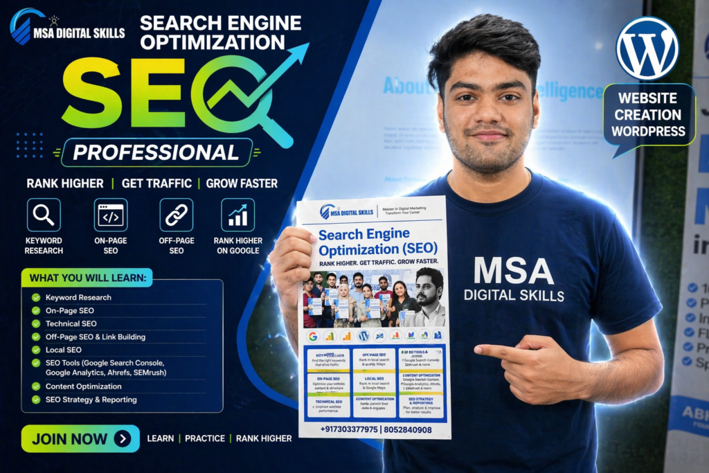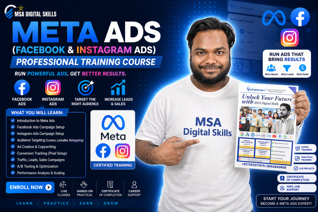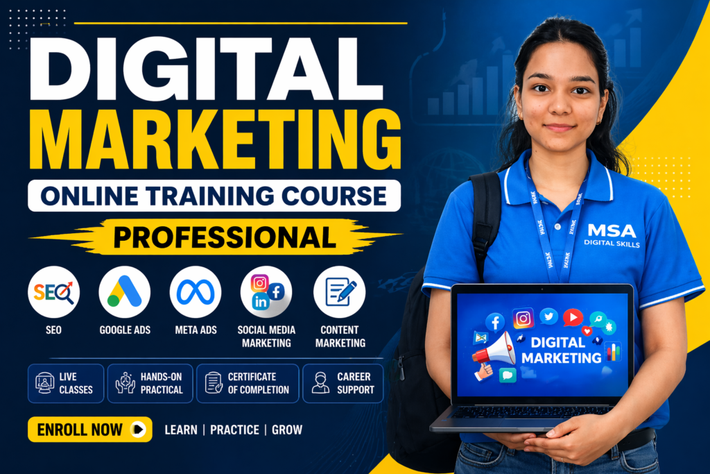 MSA Digital Skills Online is a platform where you can learn digital marketing from anywhere in India through live, practical classes. We provide training in SEO, Social Media Marketing, Google Ads, Meta Ads, and AI tools with real projects and hands-on experience.